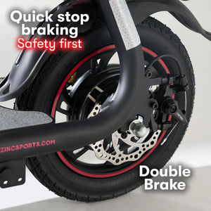 The Zinc Liberty 350W Seated Electric Scooter offers superior safety with front and rear disc brakes, ensuring reliable and responsive stopping power for a smooth, secure ride every time.